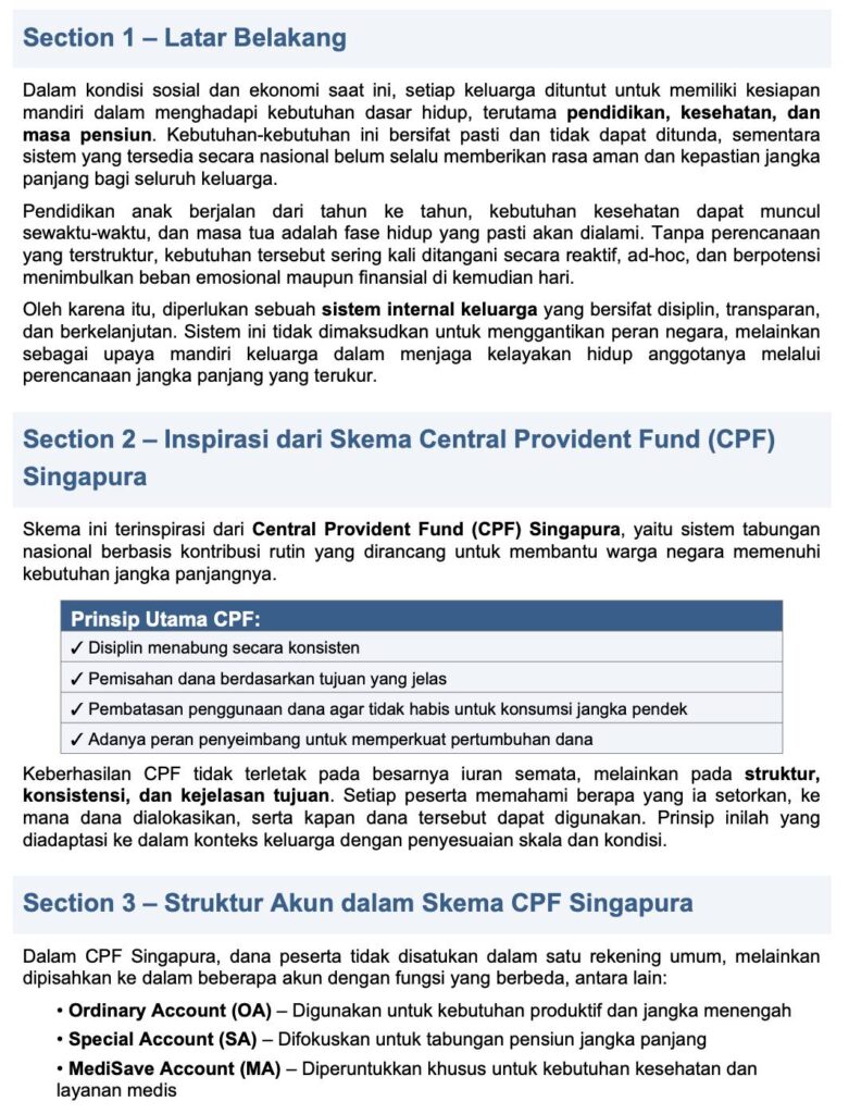Ada 3 (tiga) kebutuhan pokok keluarga besar yang perlu persiapan dana, yaitu pendidikan, kesehatan dan pensiun. Untuk hal tersebut, kami membuat skema dengan nilai yang relatif rendah agar bisa diikuti oleh seluruh keluarga inti. Keluarga inti adalah keluarga dari saudara kandung saya.