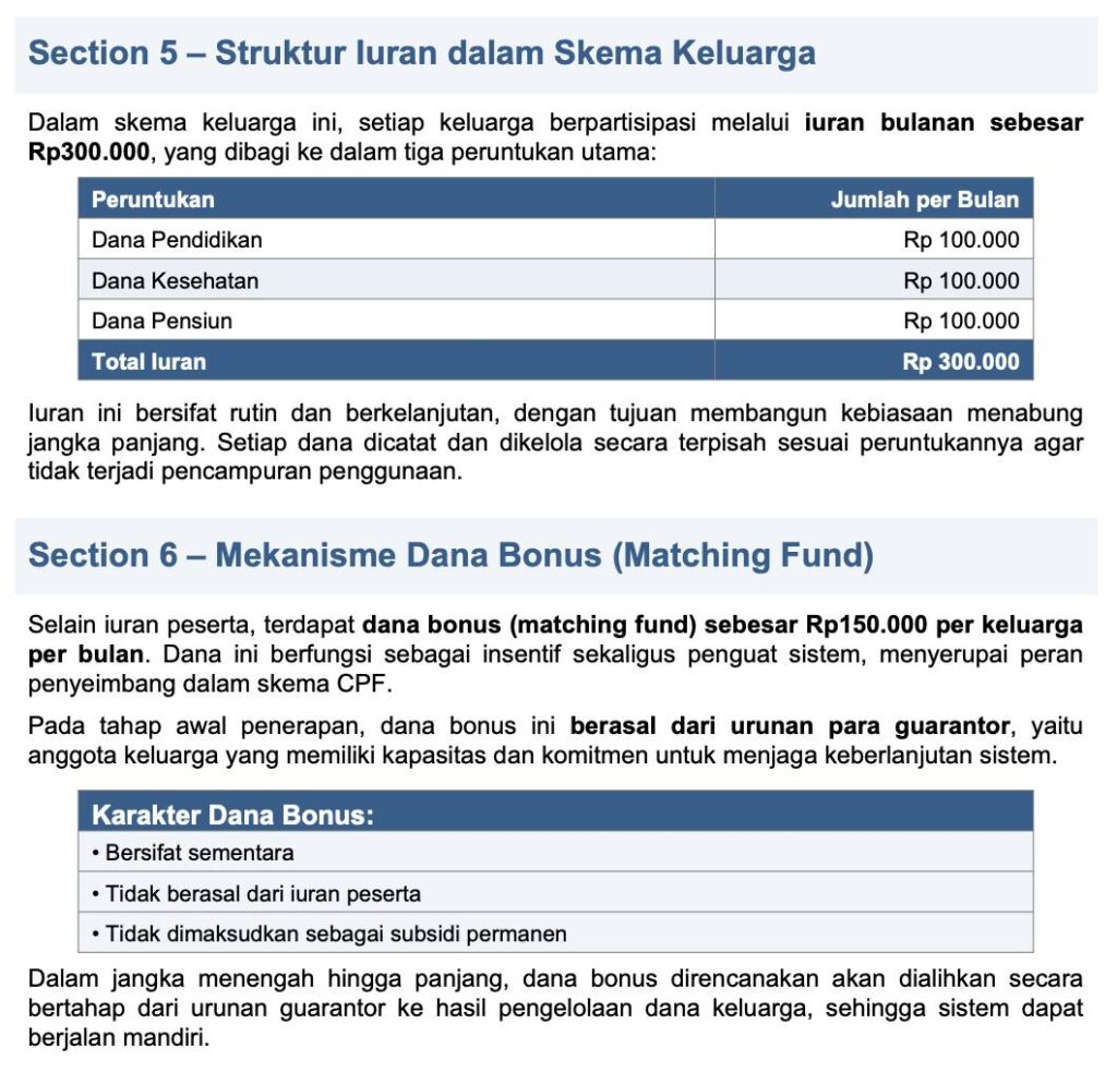 2. Setiap keluarga inti akan menyetorkan dana iuran sebesar Rp. 300.000,- terdiri dari 100 ribu untuk pendidikan, 100 ribu untuk kesehatan dan 100 ribu untuk dana pensiun