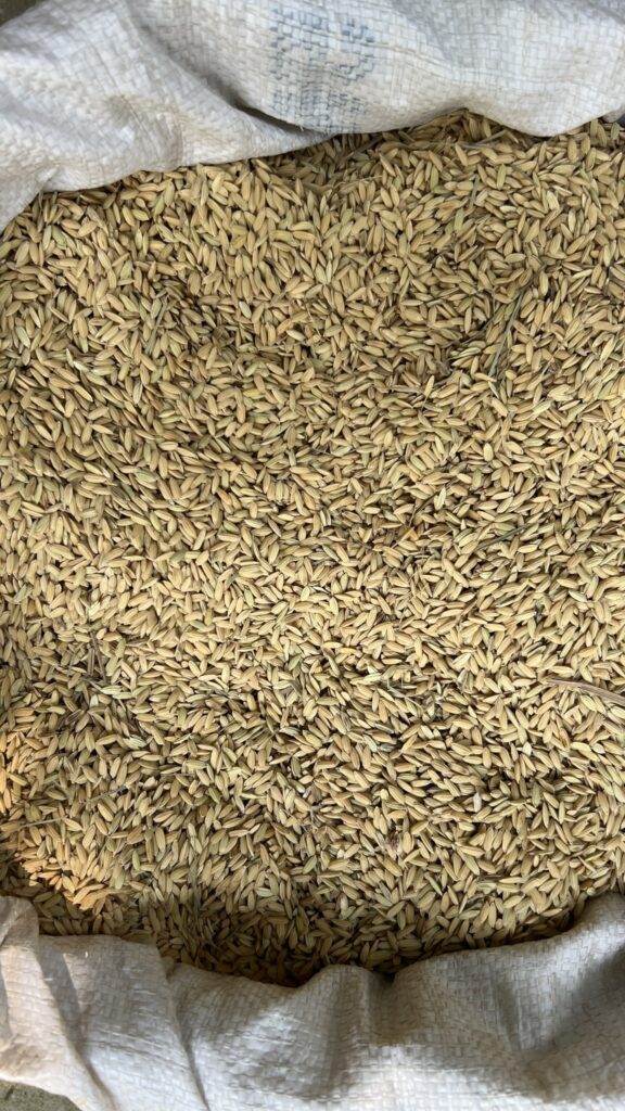 Sebagian padi di bagian pinggir sawah pekarangan rumah kabin Zeze Zahra sudah dipanen. Padi tersebut dirontokkan secara manual, kemudian dijemur dan digiling. Hasilnya adalah beras dengan treatment alami pertama dari pekarangan rumah kabin Zeze Zahra.