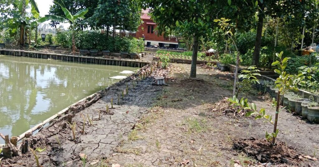 Di dekat kolam ditanami dengan jambu kristal hasil cangkokan sendiri. Jambu kristal dipilih karena tanaman ini bisa di pruning sehingga daun dan rantingnya tidak terlalu tinggi.
