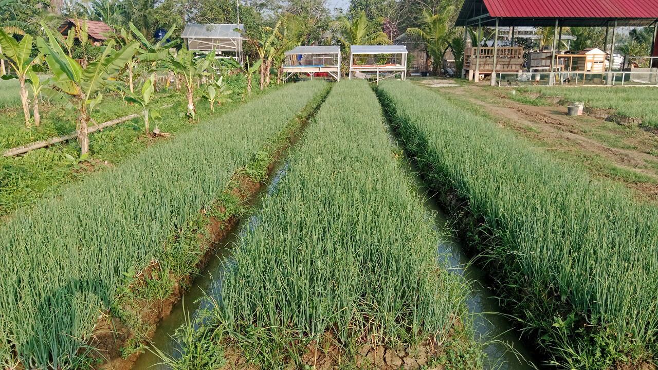 Menanam bawang merah pada bedengan yang belum lama disiapkan.