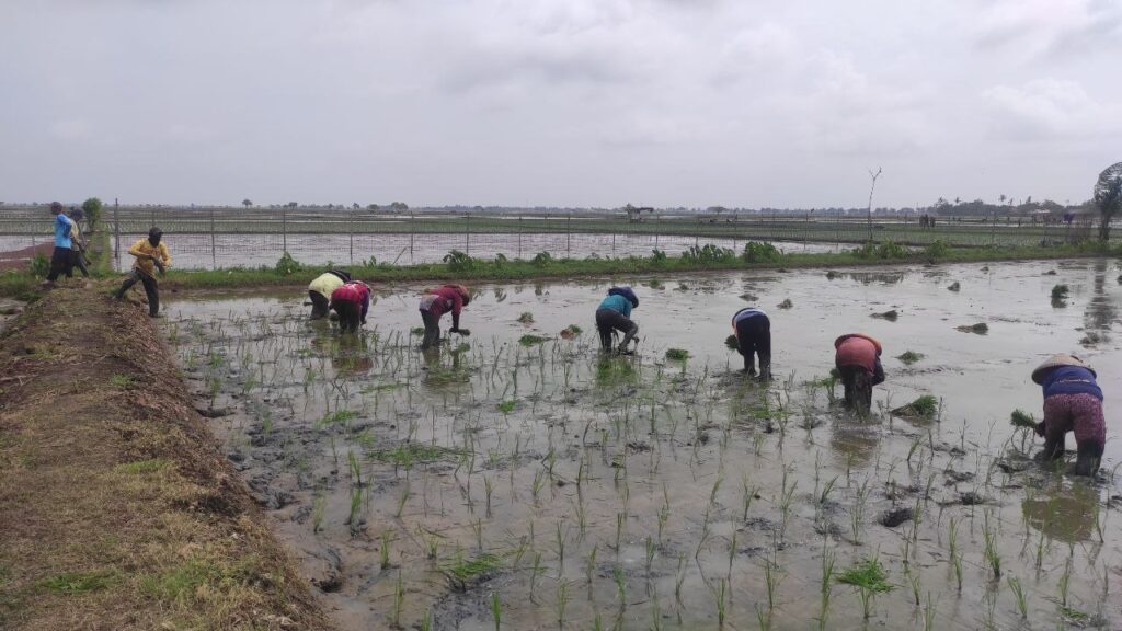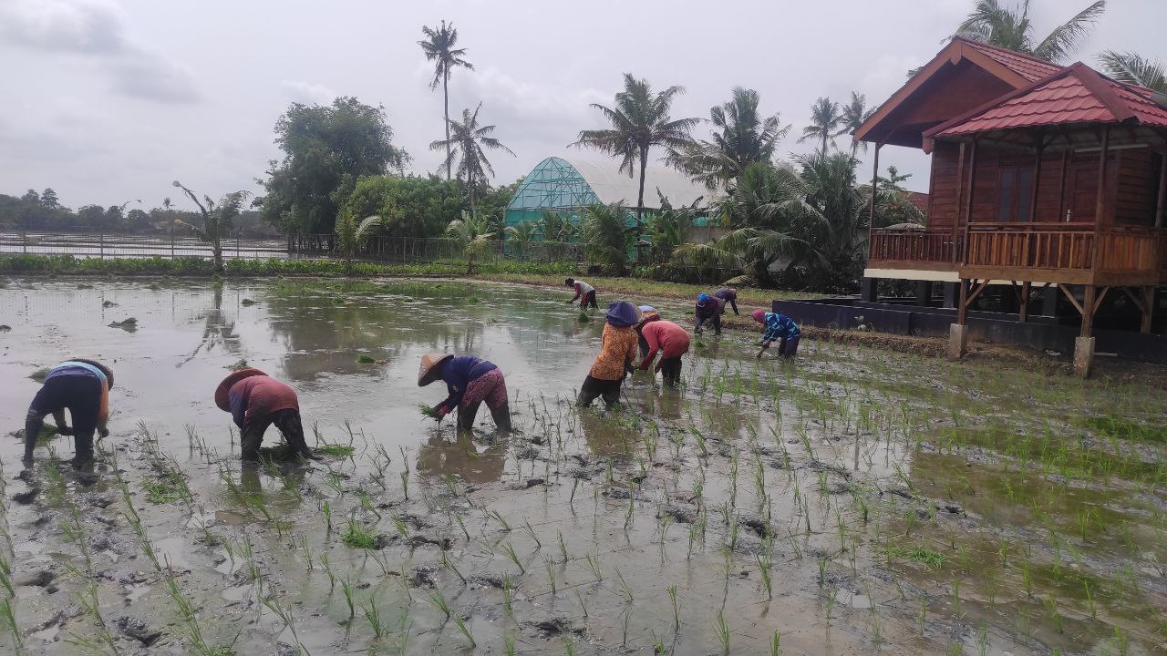 Kelihatannya dalam satu petak ada banyak sekali petani yang menanam padi. Ini karena sistemnya adalah keroyokan. Sekelompok petani (umumnya ibu-ibu) akan bergabung mengerjakan sawah secara bergiliran. Misalnya 1 ha sawah ditarget selesai dalam satu hari.