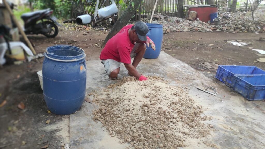 4. Tahapan akhir, semua bahan dimasukkan dalam drum atau ember dan sebelum di tutup diberikan boosterfit atau EM4 peternakan (cairan probiotik) dgn takaran 20 kg/ 1 tutup botol aqua, atau 5 tutup botol aqua per 100 kg