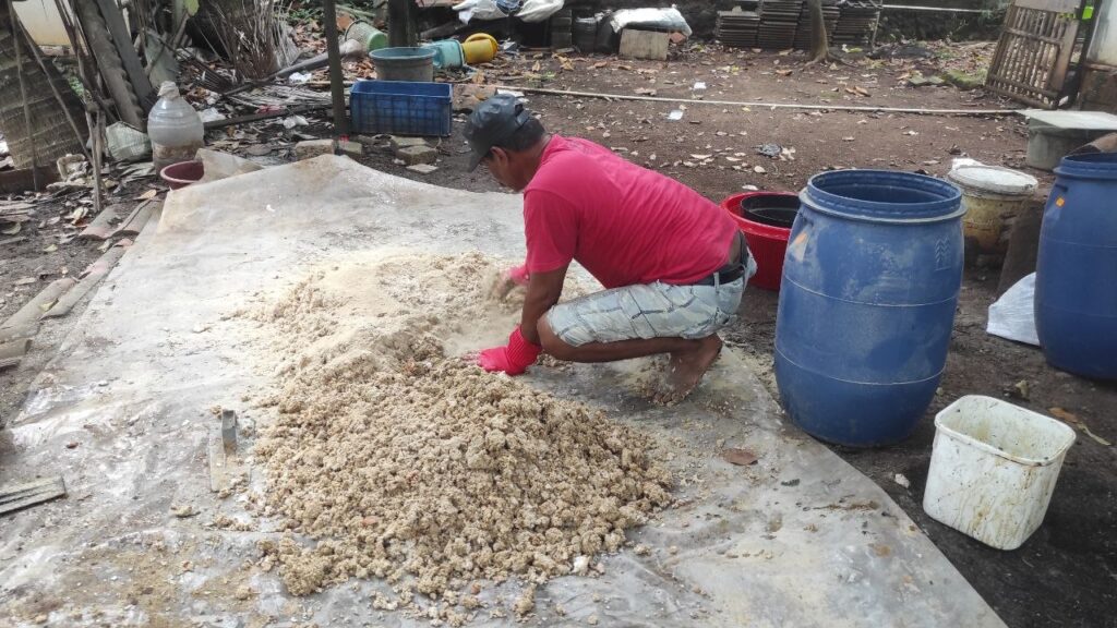 3. Limbah sisa makanan ditambah dengan ampas kelapa, daun singkong/ubi dan dedak, diaduk sampai mamel (lembab)