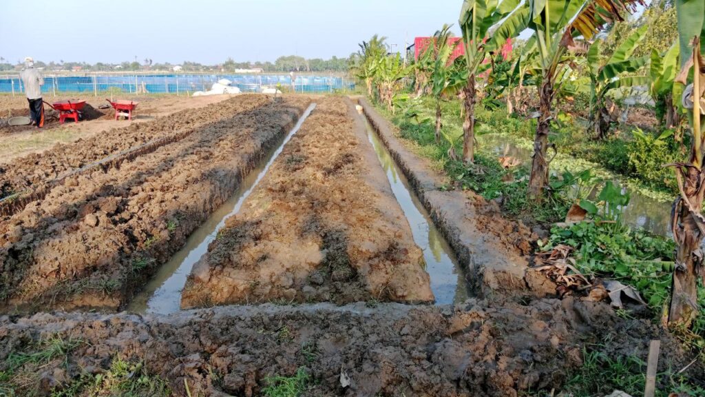 Pembuatan bedengan ini sebenarnya memiliki tujuan multi fungsi. Selain untuk menanam sayuran, pembuatan bedengan ini bertujuan memperbaiki struktur tanah tanaman pisang di pinggir saluran, memperbaiki jalur pengairan dan karena ingin menanam genjer di pinggir saluran air.