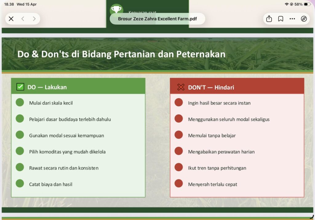 Namun saya pikir ini masih selaras dengan visi dan misi Zeze Zahra maupun dengan Rumah Edukasi Dewi Lia Astuti. Juga selaras pada amanah dari pak Bayu Diningrat agar Zeze Zahra bisa memberikan kontribusi positif bagi masyarakat. Disatu sisi, Zeze Zahra bisa provide hasil pertanian dan peternakan baik untuk konsumsi maupun dibawa pulang, dari sisi staff perusahaan juga mendapat manfaat ide usaha, tantangan, peluang dan strategi dari pengalaman Zeze Zahra.