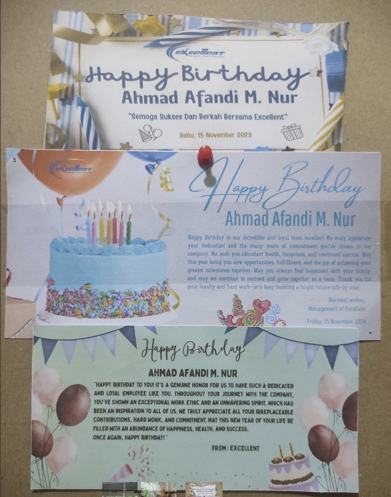 Hal ini diberikan dengan pertimbangan sederhana : tidak banyak dari kami yang ulang tahunnya dirayakan. Banyak dari kami yang ulang tahunnya dirayakan dalam bentuk ucapan setelah mereka bersekolah atau mereka bekerja di Excellent atau Aktiva.
